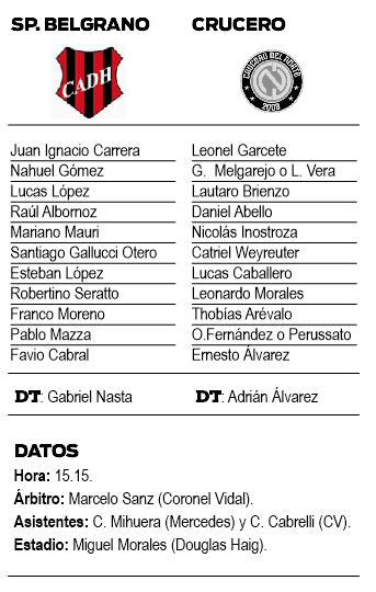 Cuatro cambios haría el entrenador Gabriel Nasta y de este modo su once inicial sería con: Juan Ignacio Carrera; Nahuel Gómez, Lucas López, Raúl Albornoz y Mariano Mauri; Santiago Gallucci Otero, Esteban López, Robertino Seratto y Franco Moreno; Pablo Mazza y Favio Cabral.