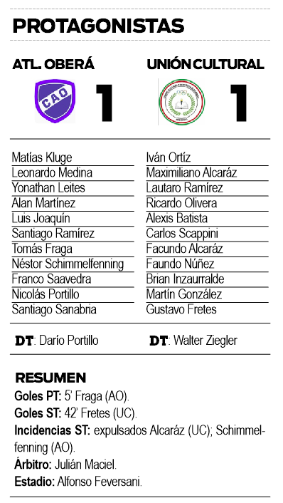 En la otra llave, Unión Cultural de Eldorado logró la heroica en el estadio Alfonso Feversani de la Capital del Monte y eliminó a Atlético Oberá, al igualar 1-1. Luego del 1-0 que alcanzó en la ida, al equipo eldoradense le alcanzaba con el empate, el mismo que lo consiguió en la agonía del partido y con un hombre menos.