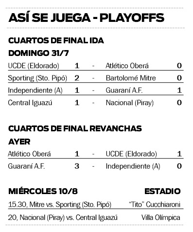 Dos encuentros no se pudieron disputar en la jornada de ayer a raíz de las lluvias del viernes que dejaron en malas condiciones los terrenos de juego. Se trata de las revanchas de cuartos de final entre Mitre vs. Sporting de Santo Pipó y Nacional vs. Central Iguazú.