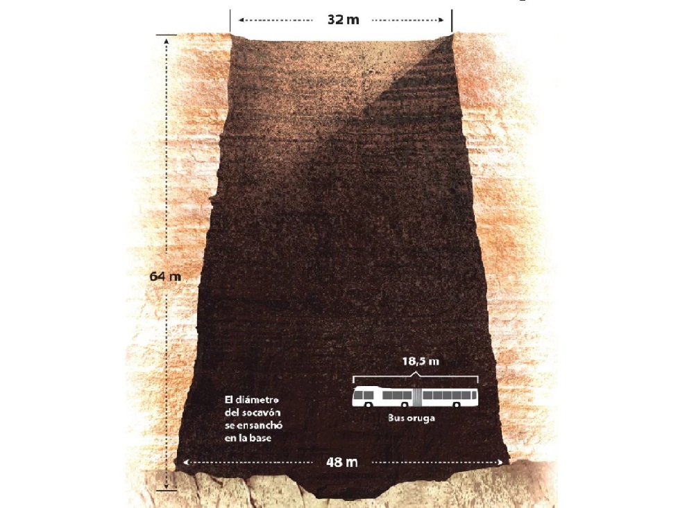 El director de la Sernageomin, Franklin Céspedes, precisó que el socavón tiene “32 metros de diámetro y profundidad de 64 metros” y confirmó que “la base es más ancha ya que llega a 48 metros y podría crecer mucho más”.