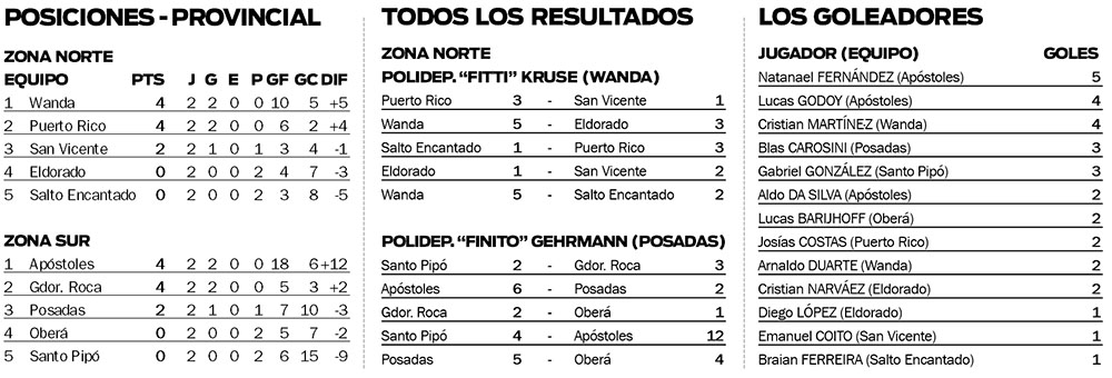 El Provincial había arrancado el sábado en el Polideportivo “Finito” Gehrmann de Posadas, con la disputa de la Zona Sur. En ese grupo, Apóstoles y Gobernador Roca picaron en punta con puntaje ideal. Los dirigidos por Amado Garay derrotaron primero a Posadas, por 6-2; y luego aplastaron a Santo Pipó, por 12-4. En tanto, Roca abrió el juego con victoria sobre los pipoceños, por 3-2; y luego derrotó a Oberá, por 2-1.