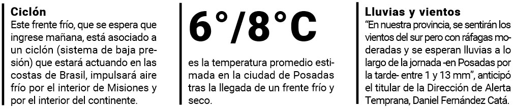 Según indicaron desde la página Pronóstico Misiones “existe la probabilidad de nevadas en regiones altas del Brasil, y la caída de aguanieve a pocos kilómetros de Misiones, en el Estado de Santa Catarina”. Este frente frío está asociado a un ciclón (sistema de baja presión) que estará actuando en las costas de Brasil, impulsará aire frío por el interior de Misiones y por el interior del continente.