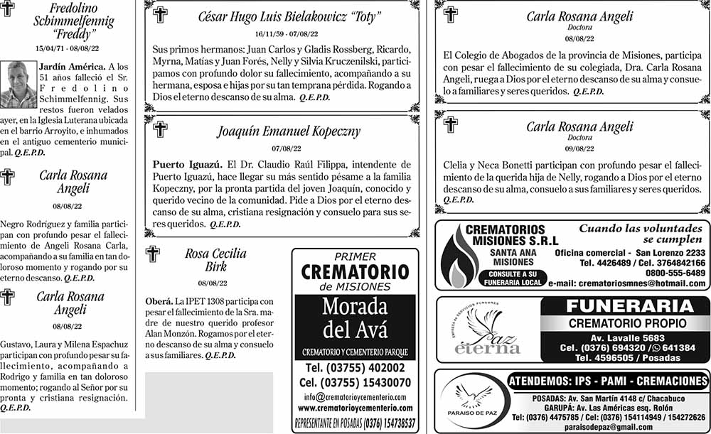 Fúnebres del Miércoles 10 de Agosto de 2022