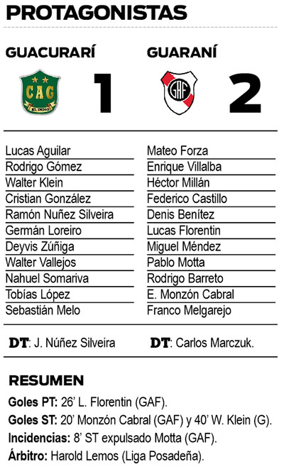A los 26 minutos de la primera etapa y tras un centro preciso de Pablo Motta (expulsado por doble amarilla), Lucas Florentín conectó de cabeza para establecer la ventaja de Guaraní, 1-0. Guacurarí no le encontraba la vuelta para poner en riesgo al fondo y al arco de Mateo Froza.