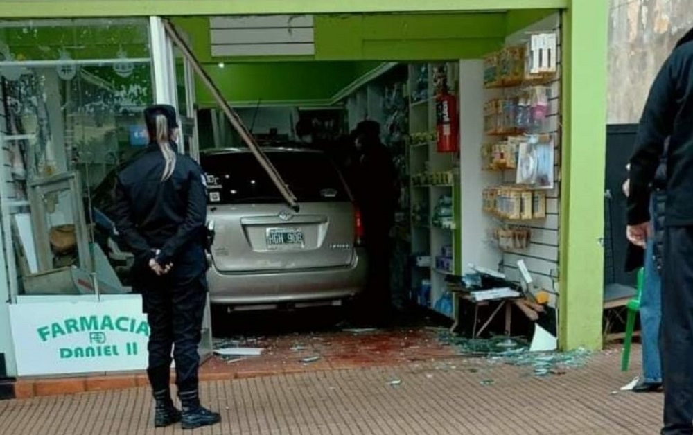Este miércoles por la tarde, en un hecho inusual, un automóvil Yoyota Fielder realizó una peligrosa maniobra en pleno centro de San Vicente, subió a la vereda y “atropelló” de lleno el frente de un local farmacéutico sobre la avenida Libertador.