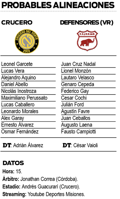 Con los ánimos tocados por el mal presente que está atravesando, pero con toda la ilusión de volver a sumar de a tres para encaminar su rumbo en el Torneo Federal A, Crucero del Norte recibirá hoy a Defensores de Belgrano de Villa Ramallo, por la fecha 24.