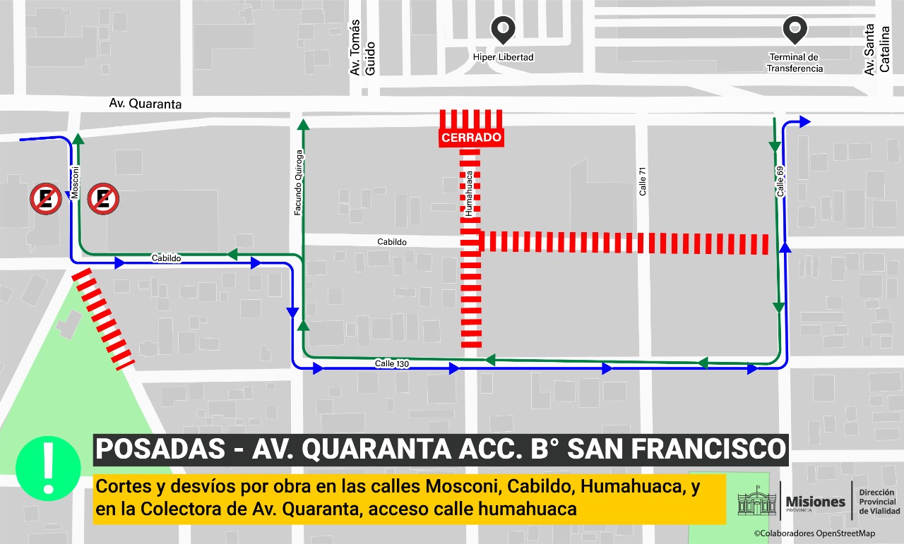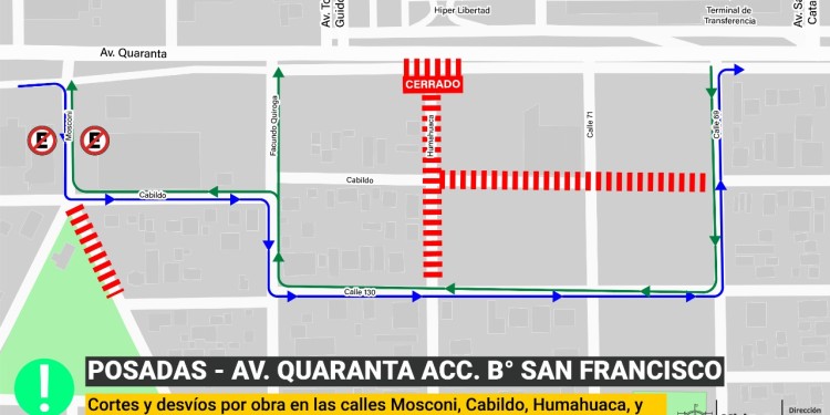 Desde este martes 16, el tránsito estará restringido en el ingreso al barrio San Francisco de Posadas, desde Av. Quaranta hacia Calle 73 y colectora derecha, así también en calle 73 y calle 130.