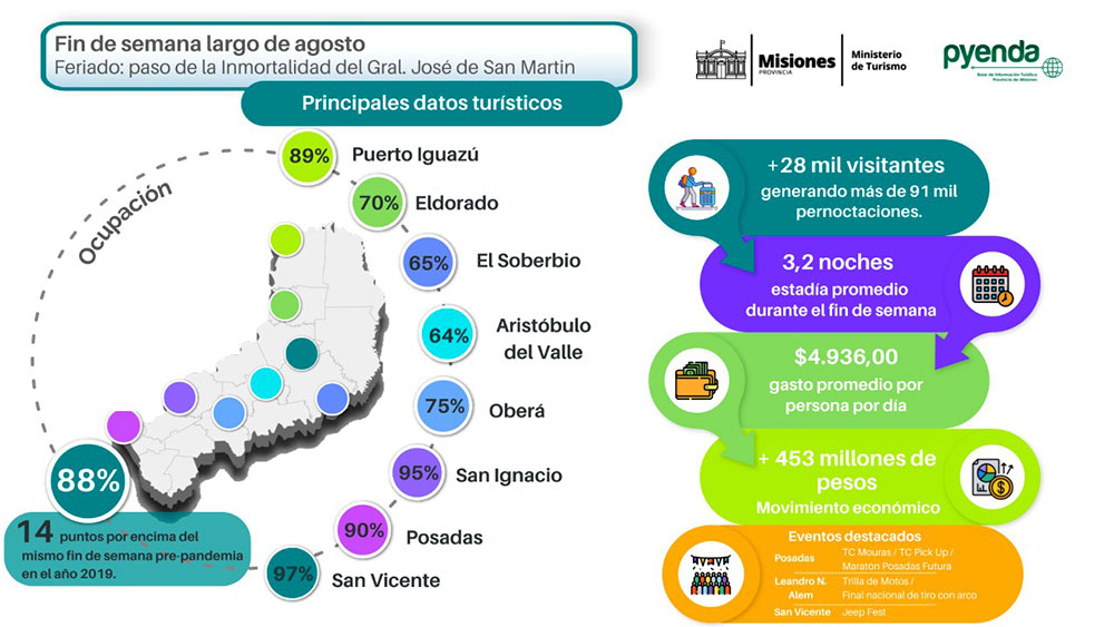Según datos brindados por el Ministerio de Turismo de Misiones, del 88% de ocupación de alojamiento promedio, Puerto Iguazú tuvo 89%; Posadas 90%; San Ignacio 95%; El Soberbio 65%; Oberá 75%; Aristóbulo del Valle 64%; Eldorado 70% y San Vicente 97%.