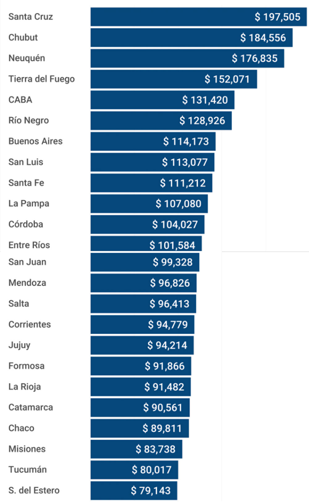 En el otro extremo de la tabla, los mejores sueldos se registran en Santa Cruz con 197 mil pesos de promedio, seguida por Chubut y Neuquén que superan los 180 mil.