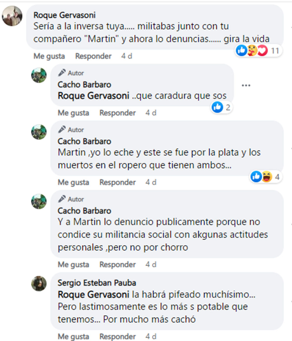 Bárbaro inmediatamente respondió: “Que caradura que sos” y agregó “Martín, yo lo eche y éste (en referencia a Rodríguez) se fue por la plata y los muertos en el ropero que tienen ambos…”. Y continuó: “Y a Martín lo denuncio públicamente porque no condice su militancia social con algunas actitudes personales, pero no por chorro”.