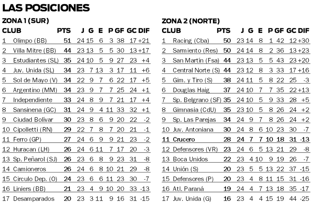 El Colectivero, en tanto,está en la undécima colocación a siete de Gimnasia y Tiro y Sportivo Belgrano de San Francisco, que ocupan los puestos 8º y 7º, en la tabla de arriba; pero a nueve, en la tabla de abajo, de Atlético Paraná, que ocupa el puesto 16º y que, si el certamen terminará hoy, estaría descendiendo junto a Juventud Unida de Gualeguaychú.