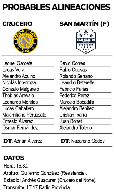 Sin mucho margen para seguir dejando puntos en el camino, si es que quiere alcanzar el objetivo inicial de meterse entre los ocho primeros de la zona B (Norte), Crucero del Norte recibirá esta tarde a San Martín de Formosa, en el marco de la vigésimasexta fecha del Torneo Federal A, con la obligación de alzarse con los tres puntos en juego.