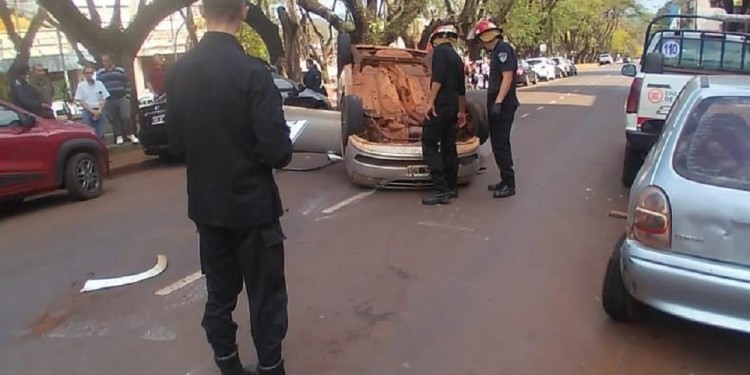 Este miércoles en horas de la siesta y sobre la avenida Sarmiento (frente al Casino) de la ciudad de Oberá un vehículo -Corsa classic color gris- volcó tras impactar contra un auto estacionado sobre la misma arteria.