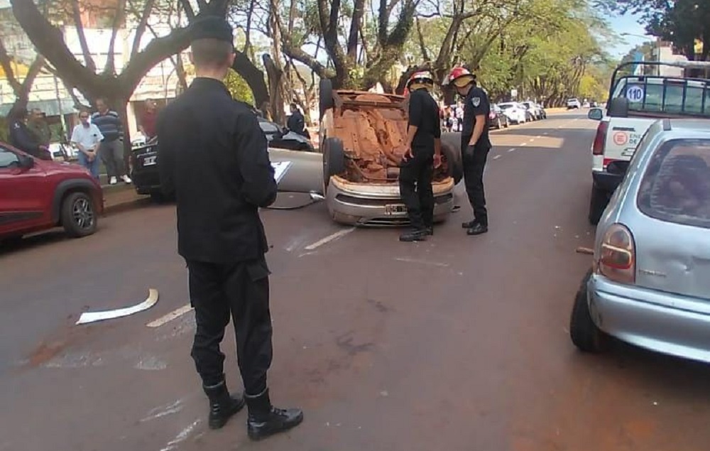 Este miércoles en horas de la siesta y sobre la avenida Sarmiento (frente al Casino) de la ciudad de Oberá un vehículo -Corsa classic color gris- volcó tras impactar contra un auto estacionado sobre la misma arteria.