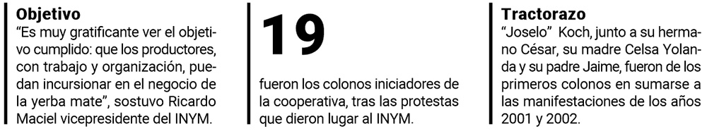 “Hace dos décadas estuvimos en los tractorazos que se realizaron por la profunda crisis que existía y que desembocaron en la creación del INYM”, recordó José Enrique “Joselo” Koch, presidente de la Cooperativa. “Hoy presentamos nuestra marca de yerba mate; hoy somos pequeños y medianos productores industrializados”, destacó.