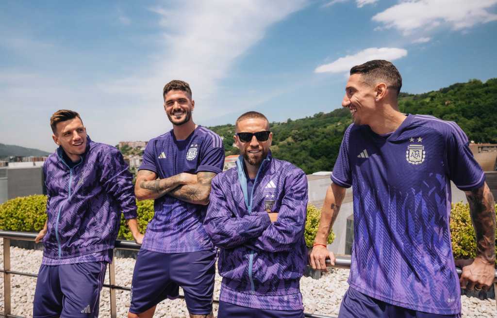 Tanto Messi como varios integrantes de la Scaloneta posaron con la vestimenta que combina dos tonos diferentes de púrpura con detalles plateados -algo que será utilizado por primera vez- y reemplazará el histórico azul.