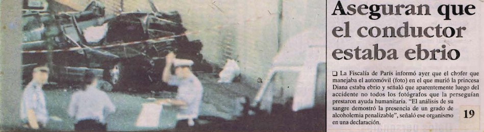 El automóvil en el que viajaba Lady Di junto a AlFayed esa fatídica madrugada, conducido por un personal de seguridad del hotel Ritz de la capital francesa, iba a 196 kilómetros por hora cuando se estrelló contra una columna de concreto, mientras era perseguido por un grupo de fotógrafos en motocicletas.