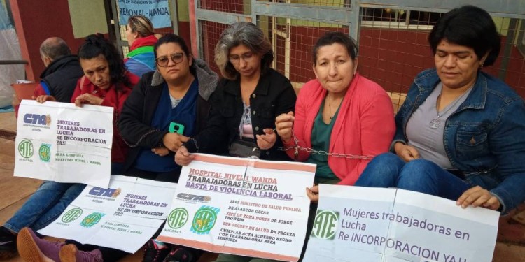 Cinco trabajadoras de limpieza  se encadenaron frente al hospital de Wanda para reclamar su continuidad laboral. Iris Morínigo, secretaria General de CTA en esa localidad relató a FM 89.3 Santa María de las Misiones que las trabajadoras comenzaron con la medida de fuerza porque las autoridades les habían garantizado que iban a ser contratadas por la nueva empresa que se hizo cargo del servicio de limpieza del nosocomio pero eso no se cumplió.