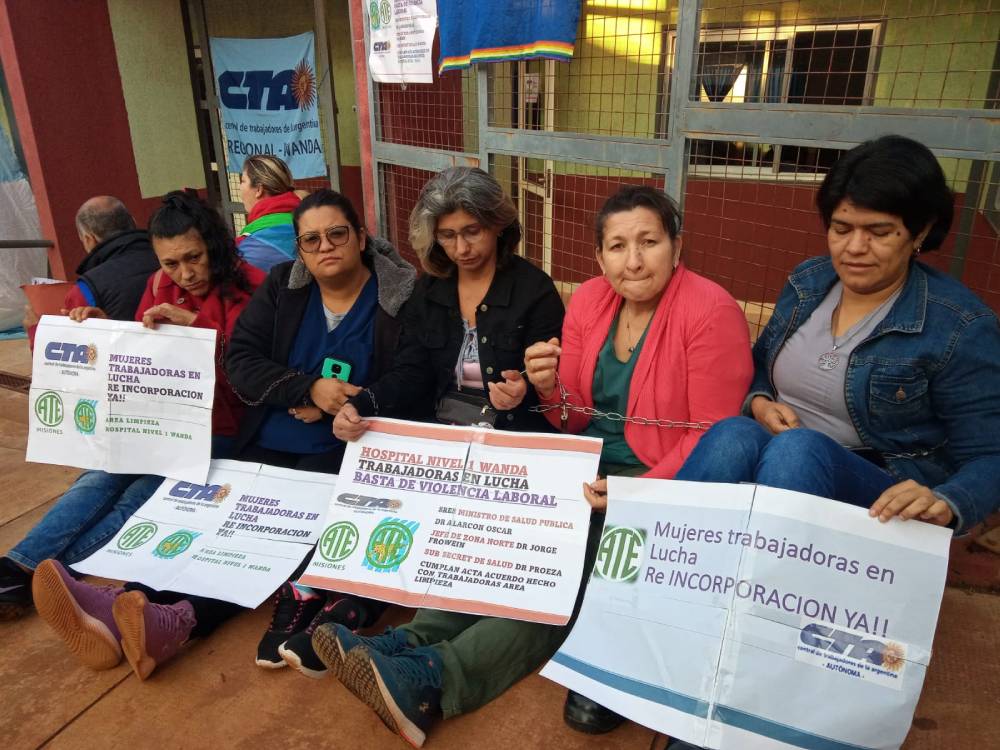 Cinco trabajadoras de limpieza se encadenaron frente al hospital de Wanda para reclamar su continuidad laboral. Iris Morínigo, secretaria General de CTA en esa localidad relató a FM 89.3 Santa María de las Misiones que las trabajadoras comenzaron con la medida de fuerza porque las autoridades les habían garantizado que iban a ser contratadas por la nueva empresa que se hizo cargo del servicio de limpieza del nosocomio pero eso no se cumplió.