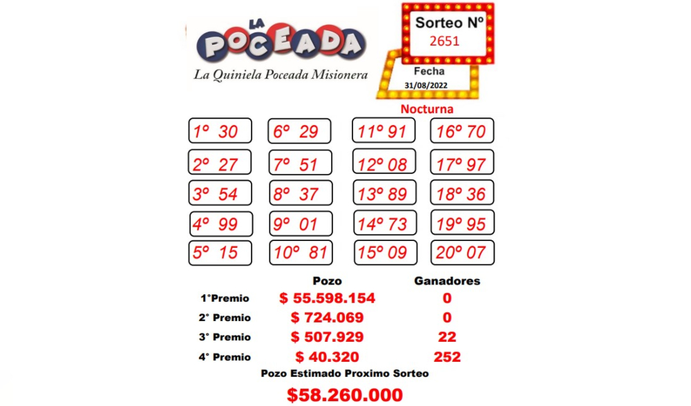 El pozo histórico de la Quiniela Poceada Misionera nuevamente quedó vacante y las expectativas de los jugadores misioneros se acrecientan. Es que para este mediodía el primer premio supera los 58 millones de pesos, confiaron fuentes del IPLyC a PRIMERA EDICIÓN.