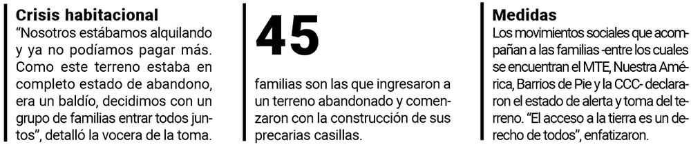 En este contexto, movimientos sociales se declararon en estado de alerta, exigen que se regularice la problemática de vivienda y advierten la extrema vulnerabilidad de la situación que atraviesan estas familias. “Se trata de un grupo de vecinos que estaba en una situación vulnerable, muchas son mujeres con bebés, que ante la crisis no pueden seguir alquilando, a algunas las echaron porque debían meses de renta y como este predio estaba vacío decidieron tomarlo y empezar a armar sus casitas para habitar el lugar”, reveló Lourdes Benítez del Movimiento de Trabajadores Excluidos (MTE).
