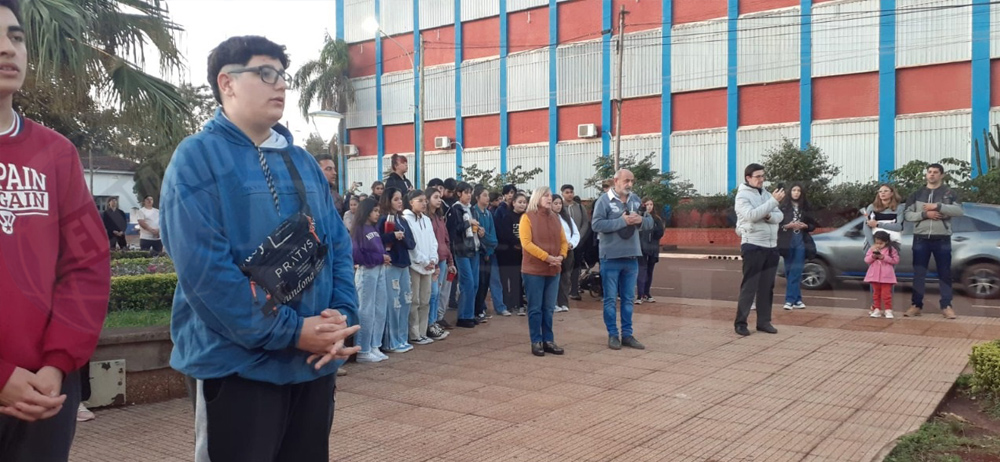 Por esta concentración, que se realizó en conjunto con la Asociación Estudiantes Apostoleños (AESA) y la Dirección de la Juventud, se suspendieron los ensayos de la Estudiantina del día de la fecha, y tanto los chicos, como docentes y padres se acercaron con mate y carteles de apoyo a Luis, realizando una cadena de oración por el estudiante que en estos momentos está en internado en el Hospital Madariaga de Posadas.