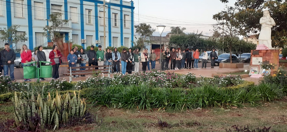 Estudiantes de todos los establecimientos educativos de Apóstoles se concentraron esta tarde-noche en la Plaza de la Madre para acompañar y brindar apoyo al joven Luis Bojcho, quien padeció un accidente en la EPET Número 5 “Fray Luis Beltran”, mientras armaba una chancha para la Estudiantina.