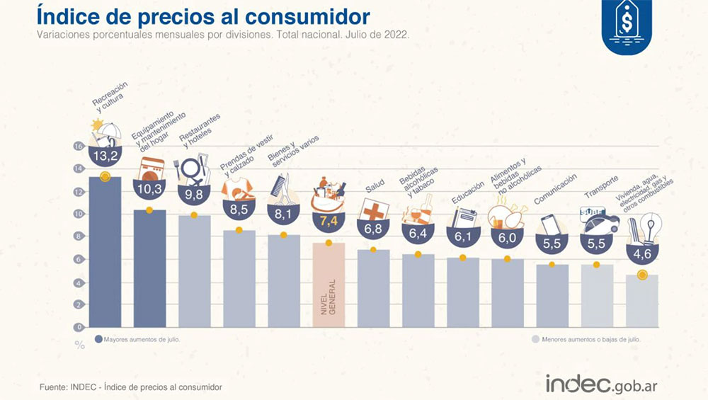 En julio, cuando se hizo la última actualización, traccionó la suba de 6,4% del rubro “Bebidas alcohólicas y tabaco”, segmento destacado por el Instituto Nacional de Estadísticas y Censos (Indec) junto a Vivienda, agua, electricidad, gas y otros combustibles (4,6%); Salud (6,8%); Comunicación (5,5%) y Educación (6,1%); y que dejó una cifra general de 7,4%, el registro más alto desde 2002, en plena crisis luego de la salida del Plan de Convertibilidad.