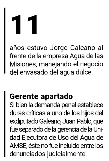 Si bien la demanda penal establece duras críticas a uno de los hijos del exdiputado Galeano, Juan Pablo que fue separado de la gerencia de la Unidad Ejecutora de Uso del Agua de AMSE, éste no fue incluido entre los denunciados judicialmente.