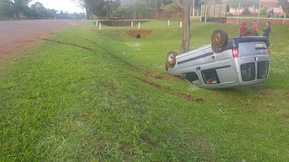 El domingo por la tarde sobre la ruta Nacional 12, a la altura del kilómetro 1.435 en Jardín América una mujer de 45 años circulaba en sentido Iguazú-Posadas a bordo de un Peugeot modelo Partner . Por motivos que se tratan de establecer perdió el control de su rodado, se despistó y volcó en la banquina, quedando su auto en posición invertida.