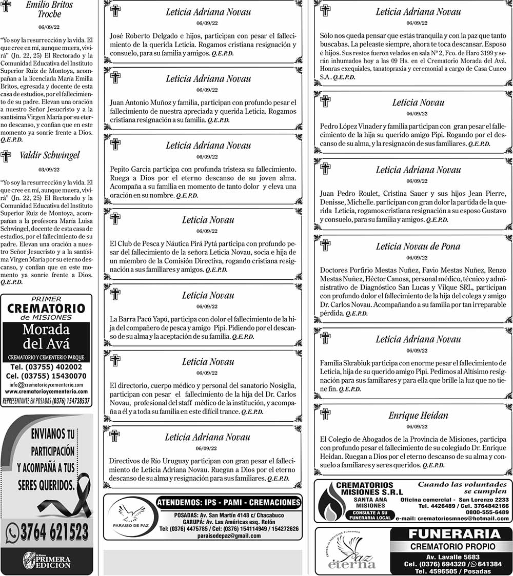 Fúnebres del Miércoles 7 de Septiembre de 2022