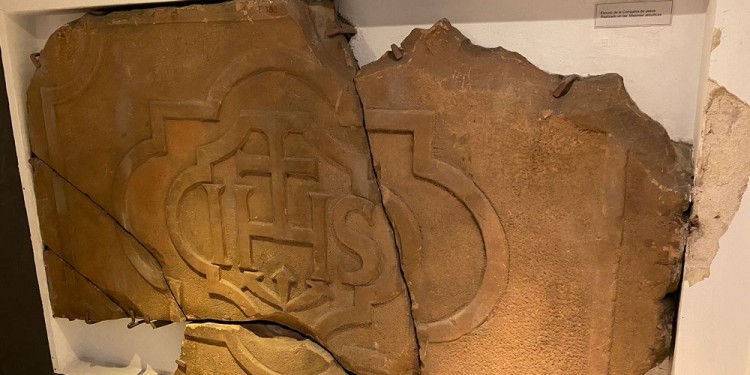 Este monograma en relieve representa a la Compañía de Jesús y se compone de las letras iníciales “I.H.S.” (Jesús Hominum Salvador, en latín)”, acompañadas de una cruz y tres clavos. La piedra fue labrada por guaraníes de la reducción jesuítica de San Ignacio.