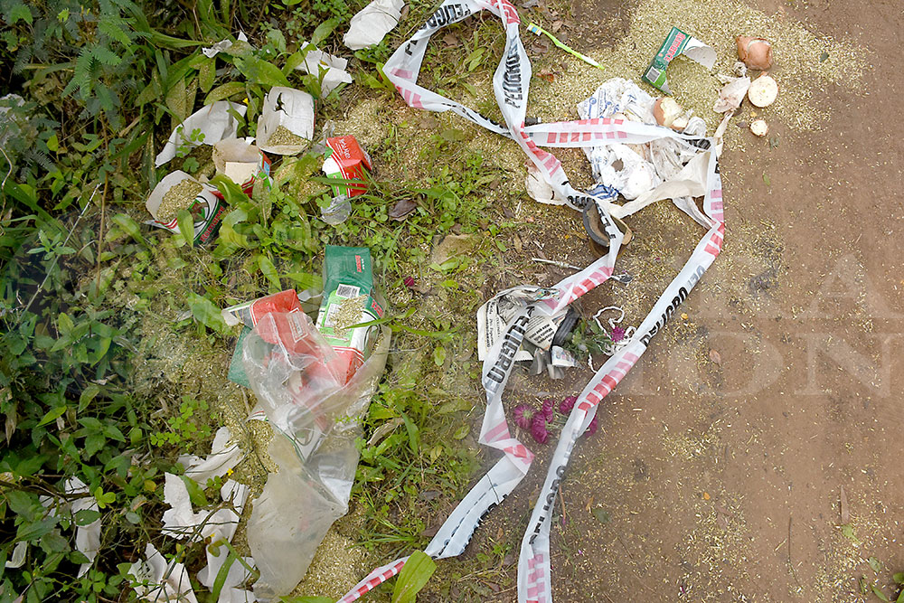 Quednau paró la cruz de muletas y tripas a un costado de Da Rosa y alrededor quedaron esparcidos paquetes de yerba, muslos y pechugas de pollo, plantines de flores, harina, azúcar, cebollas, papas. Los alimentos estaban todos cortados a machetazos y manchados de sangre, al igual que la bolsa de tela amarilla en la que la víctima los trasladaba.