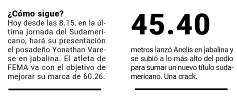 Hoy, desde las 8.15, será el turno del otro representante misionero en el evento sudamericano. Yonathan Vares (17) competirá en la final de lanzamiento de jabalina.