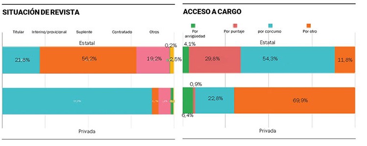 Ocho de cada diez directores de escuelas secundarias estatales son suplentes o interinos y esa inestabilidad en el cargo puede ser un obstáculo para la mejora educativa. En escuelas privadas, en cambio, casi nueve de cada diez directores son titulares. Además, en las escuelas privadas los directores tienen en promedio más antigüedad. En la gestión estatal, la mayoría accede al cargo por concurso o puntaje, pero en las privadas rigen otros mecanismos.