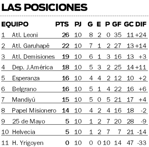 De regreso al campeón, Atlético Leoni dio la vuelta olímpica sin perder un solo partido. La campaña de los dirigidos por Morel es envidiable, ya que cosechó ocho triunfos y dos empates. Entre las victorias se cuentan festejos ante Garuhapé (3-2), Belgrano (3-2), 25 de Mayo (4-2), Mandiyú (2-1), Helvecia (4-1) y la del último finde ante Deportivo Jardín (1-0), sin olvidar dos históricas goleadas sobre Atlético Demisiones (5-0) e Hipólito Yrigoyen (9-0). El equipo campeón sólo relegó cuatro puntos, tras las igualdades ante Esperanza (0-0), de local; y Papel Misionero (3-3), en Capioví.