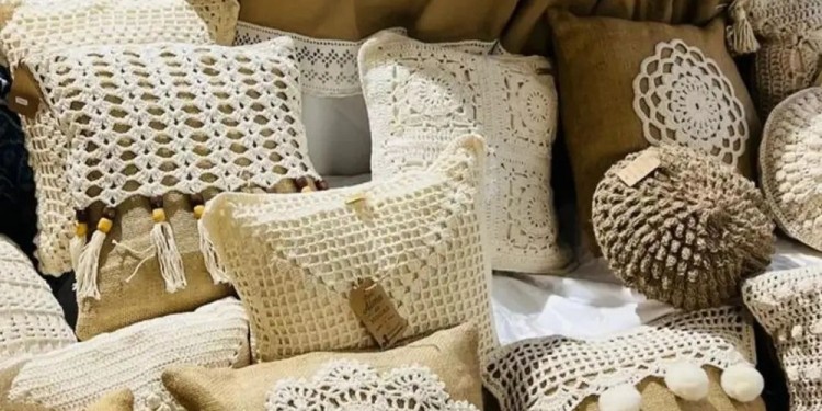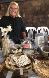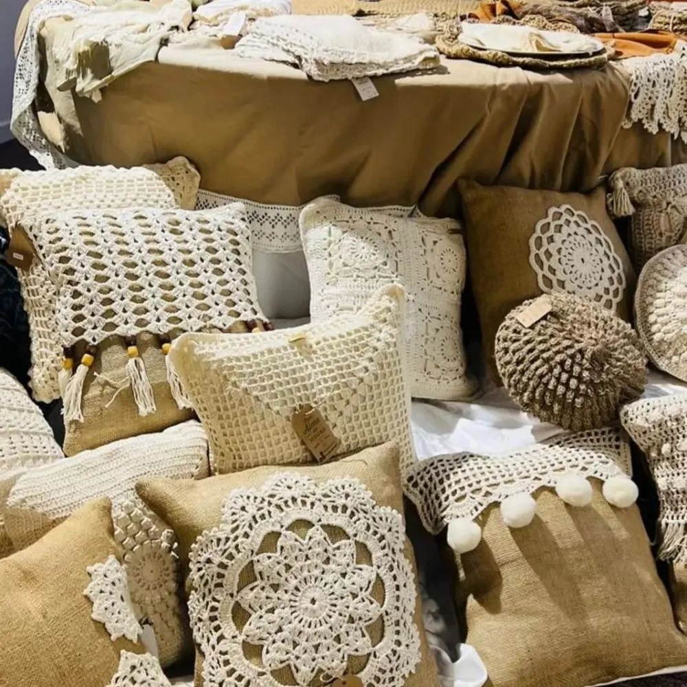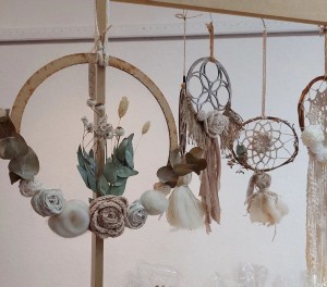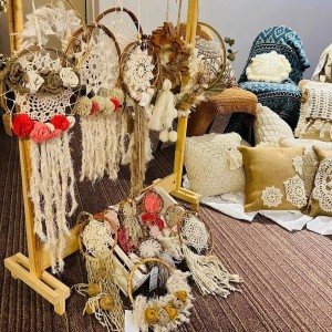 Estuvo en la Feria de Spacio Mujer y nos contó que sus creaciones son principalmente tejidas, pero también realiza varias combinando con flores de tela o esos tejidos llevados a atrapasueños, cubre botellas, bandejas, apoya platos, y tantos más.
