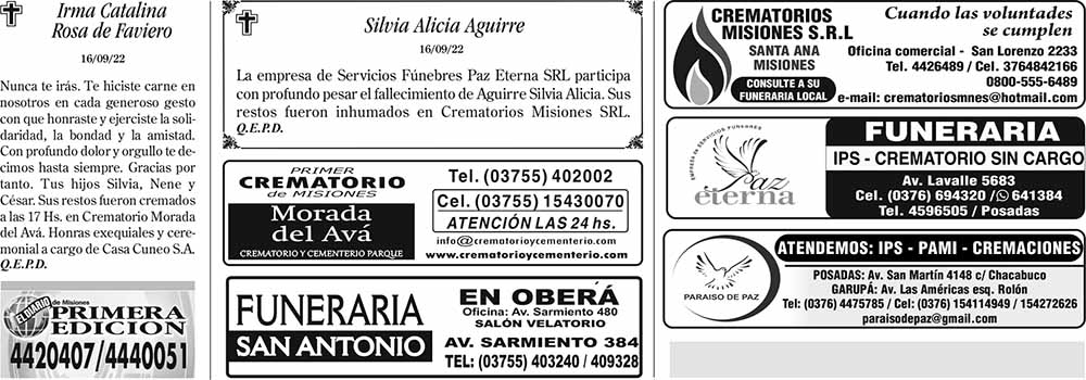 Fúnebres del Sábado 17 de Septiembre de 2022