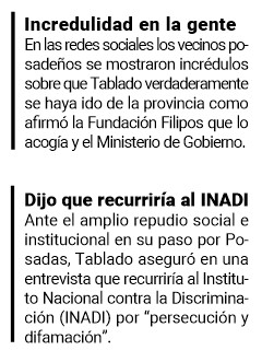 De hecho, a principio de esta semana, cuando trascendió que Tablado estaba viviendo en Misiones luego de tener que salir de Córdoba y no poder instalarse en Santa Fe, Buenos Aires y Corrientes, el referente de la fundación, el pastor Carlos González, negó que se encontrara en la sede de la institución, con domicilio en avenida Uruguay casi Barrufaldi. Un día después, el propio pastor se desdijo ante la Policía.