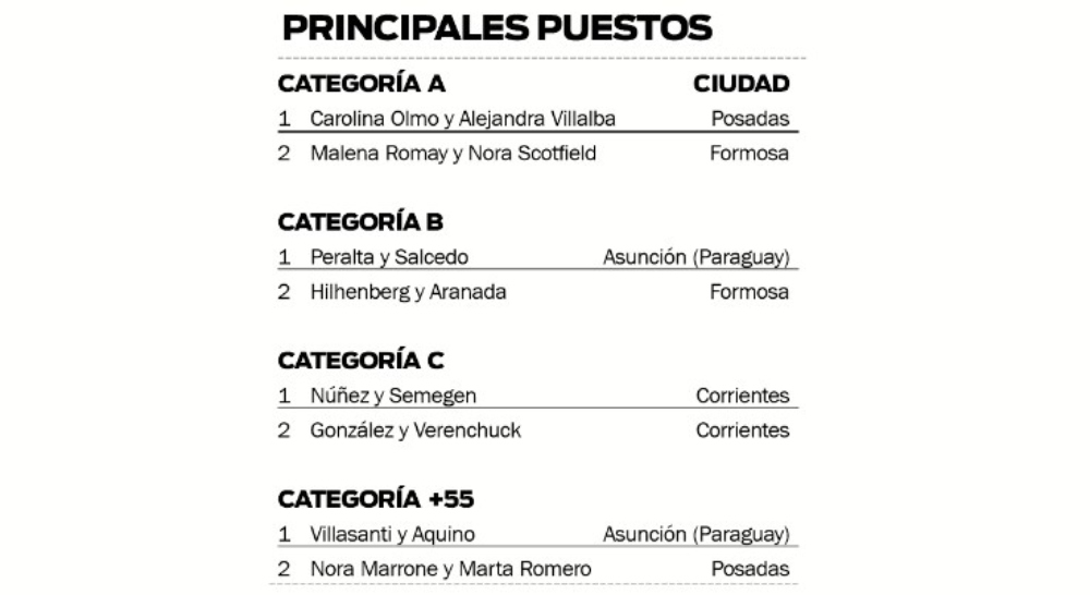 Las grandes ganadoras del certamen fueron las posadeñas Carolina Olmo y Alejandra Villalba, que festejaron en la Categoría A; mientras que en la B celebraron Peralta y Salcedo, de Asunción. En la C, la dupla correntina Núñez-Semegen fue la mejor y en +55, Villasanti y Aquino terminaron en lo más alto del podio.