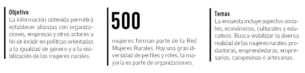 La encuesta está compuesta por una batería de preguntas donde las personas deben seleccionar alguna opción y en algunos casos deben fundamentar la respuesta. Además, se incluyen aspectos sociales, económicos, culturales y educativos, entre otros, buscando visibilizar la diversa realidad de las mujeres rurales, en sus variados territorios y actividades: productoras, emprendedoras, empresarias, campesinas, comunicadoras, artesanas, investigadoras, científicas, educadoras, profesionales, funcionarias, entre otros roles vinculados a la ruralidad.