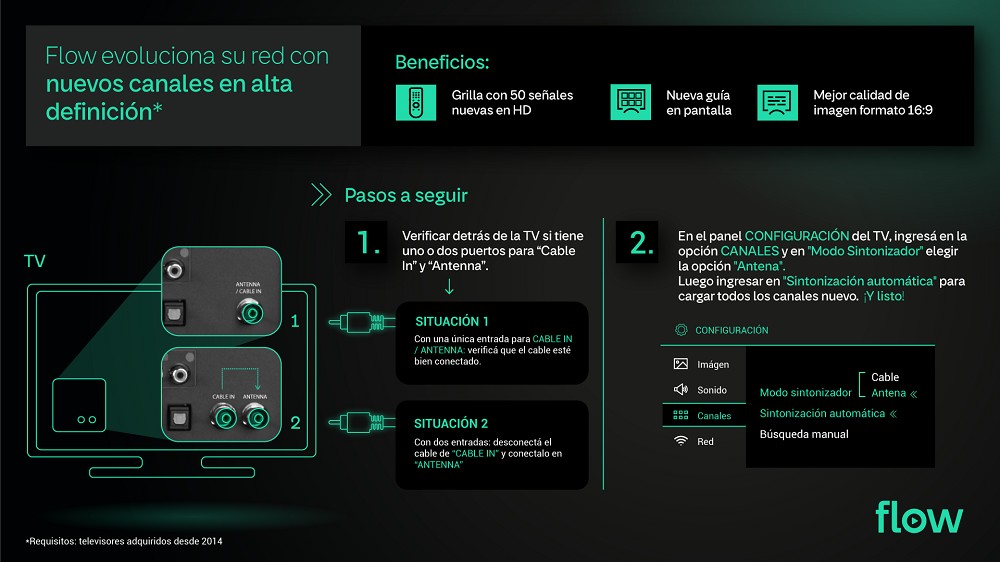 Flow está evolucionando su red de televisión clásica en Posadas, para mejorar la experiencia de los clientes y ofrecer una mejor calidad de imagen. Este nuevo desarrollo tecnológico habilita para los clientes del servicio analógico una nueva grilla de programación con nuevos canales en alta definición y una renovada guía en pantalla.