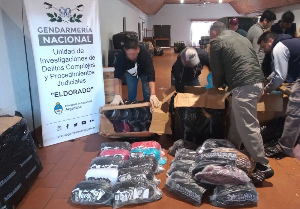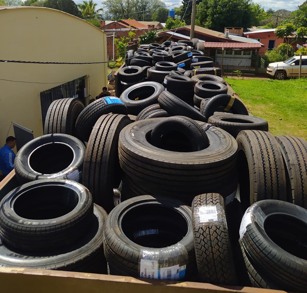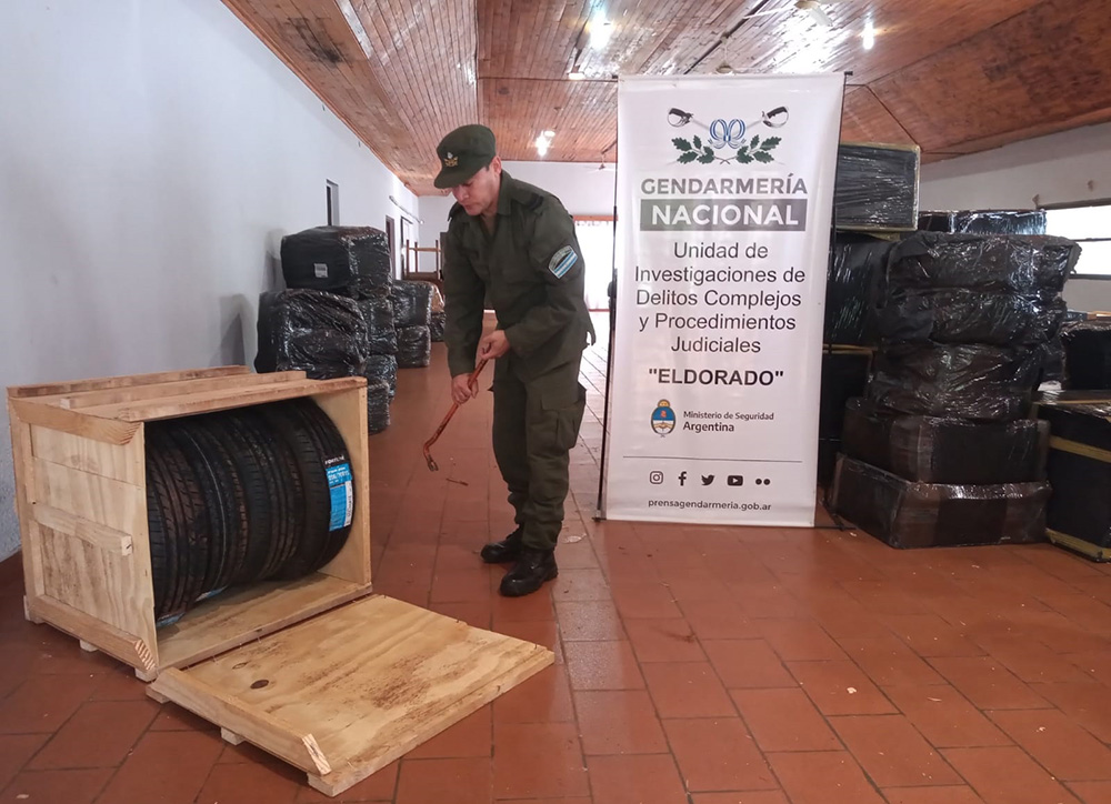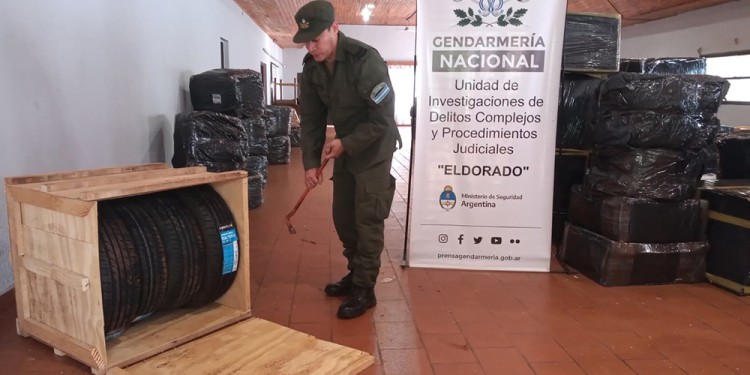 En presencia de testigos, los agentes hallaron 381 cubiertas, 206 pares de zapatillas, 3.000 gorras y 34 mochilas, los cuales eran trasladados sin aval legal.