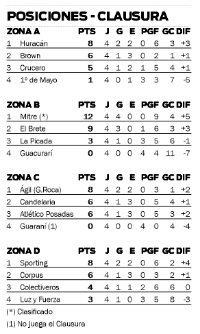 El domingo fueron programados otros dos encuentros. En la zona C, Atlético Candelaria será anfitrión de Ágil, el líder de la zona, a las 16. Mientras que Atlético Posadas tendrá jornada libre y sumará tres puntos (ya que debía enfrentar a Guaraní que se bajó del Clausura).
