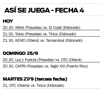 La cuarta fecha del certamen, que entrega cuatro plazas para la próxima Liga Federal, se cerrará el domingo con dos encuentros. En Posadas, en escenario a confirmar (posiblemente el Mitre), Luz y Fuerza recibirá a OTC, mientras que CAPRI hará lo propio en su Estadio frente a Siglo XXI de Puerto Rico. Ambos juegos comenzarán a las 20.30.