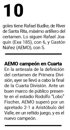 Por su parte, el Millonario de Santa Rita eliminó a uno de los candidatos al título, Atlético Oberá. Se impuso por un claro 3-1 con goles de Rafael Budke y Adrián Moraes (2).