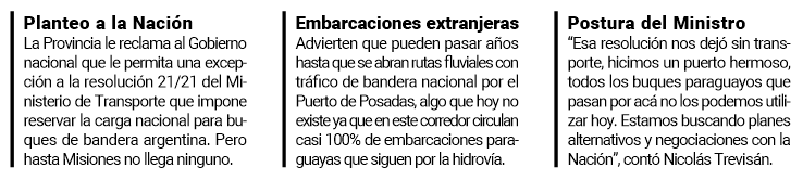 La Provincia le reclama al Gobierno nacional que le permita una excepción a la resolución 21/21 del Ministerio de Transporte que impone reservar la carga nacional para buques de bandera argentina. Esa resolución de la cartera de Transporte fue una respuesta puntual al Gobierno de la República del Paraguay que tiene reserva de cargas para los buques de su bandera y discrimina a los de bandera argentina.