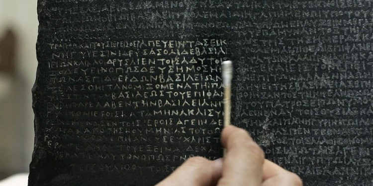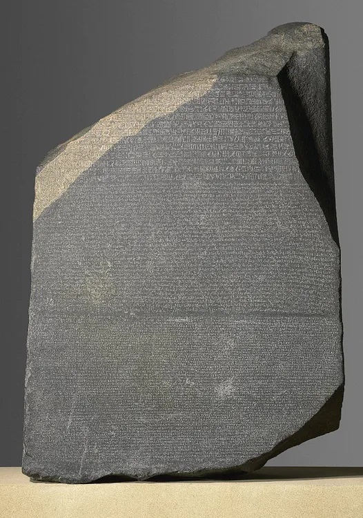 La piedra de Rosetta es una estela incompleta de granodiorita gris y rosa que data del año 196 antes de Cristo, que presenta un decreto sacerdotal sobre el rey Ptolomeo V de Egipto. El texto está en tres versiones diferentes: jeroglíficos, escritura demótica y griego, cosa que ayudó inmensamente a descifrar por fin los jeroglíficos egipcios.
