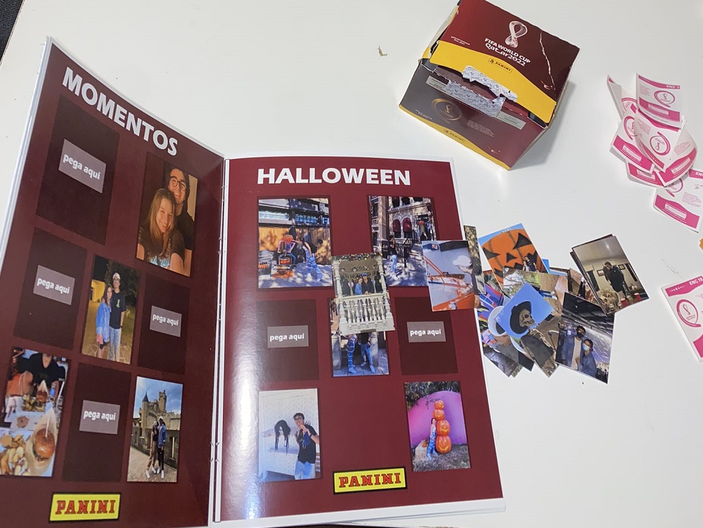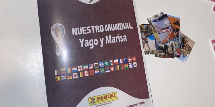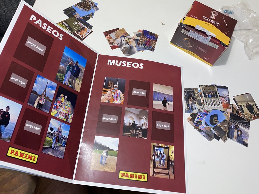 Junto a él hay una caja de sobres que, en lugar de contener figuritas de los futbolistas que participarán en Qatar, contienen fotos de ellos.