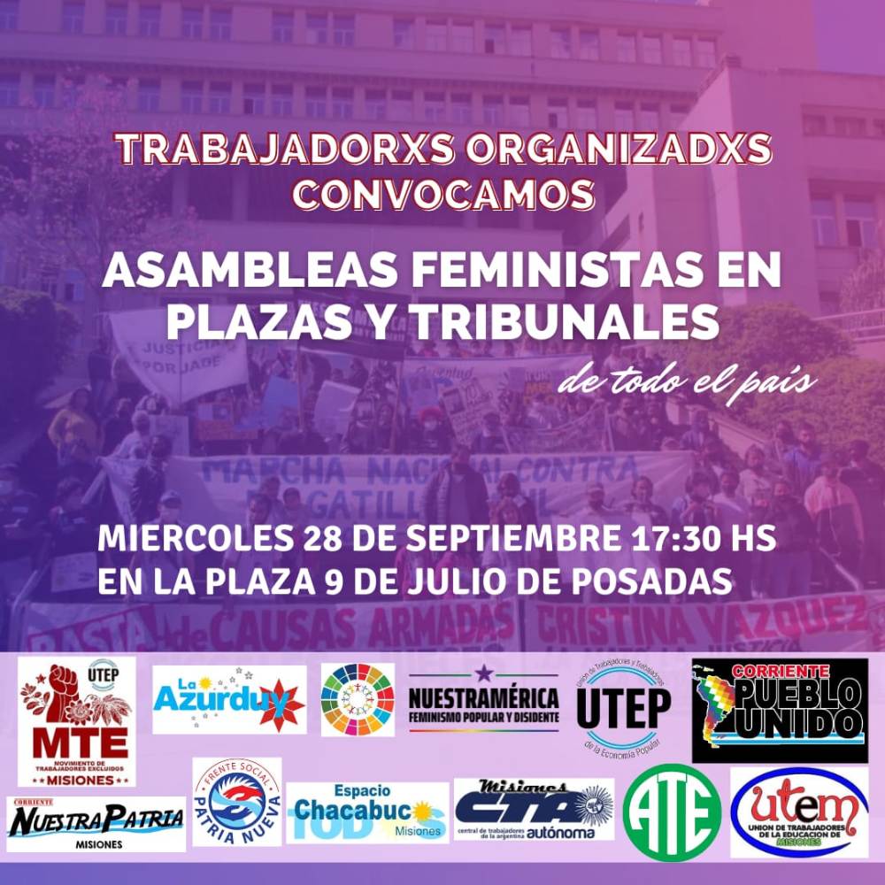 Esta tarde desde las 17.30, colectivos feministas autoconvocados realizarán una concentración en la plaza 9 de Julio de Posadas, en el marco de una convocatoria a nivel nacional en todas las plazas judiciales del país, donde se apunta a debatir y a reclamar una intersindical feminista.